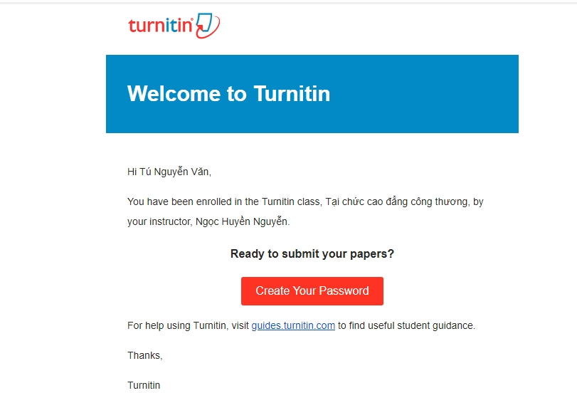 Bước 1: Kích hoạt tài khoản. Để thực hiện bước này các bạn cần nhận được một mail từ turnitin với nội dung như sau: